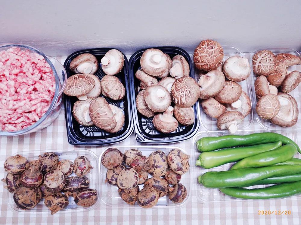 香菇、蔥花、馬蹄、豬肉和餃子皮等